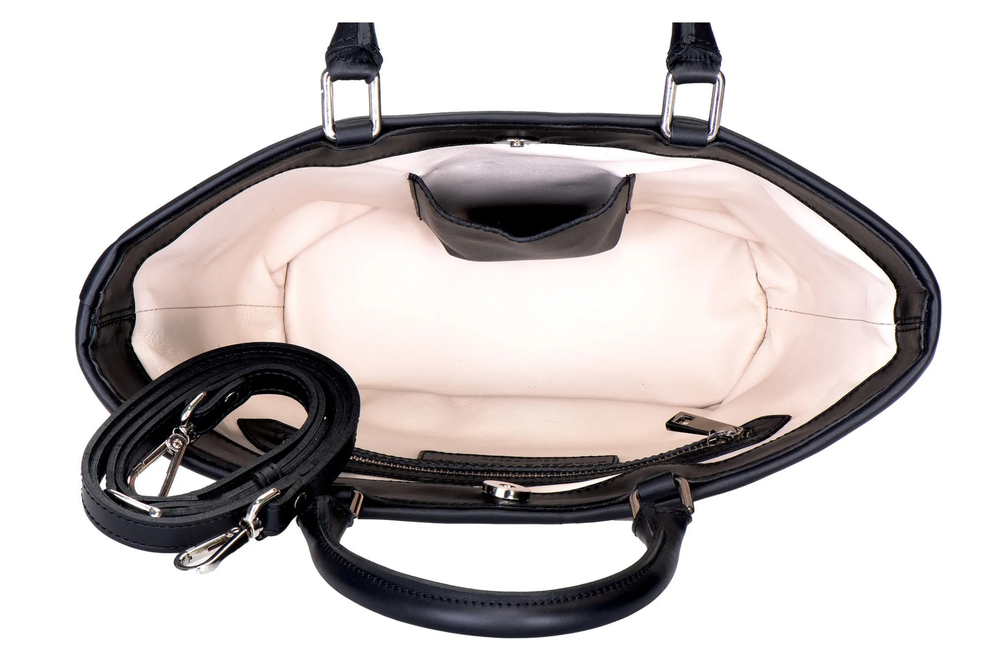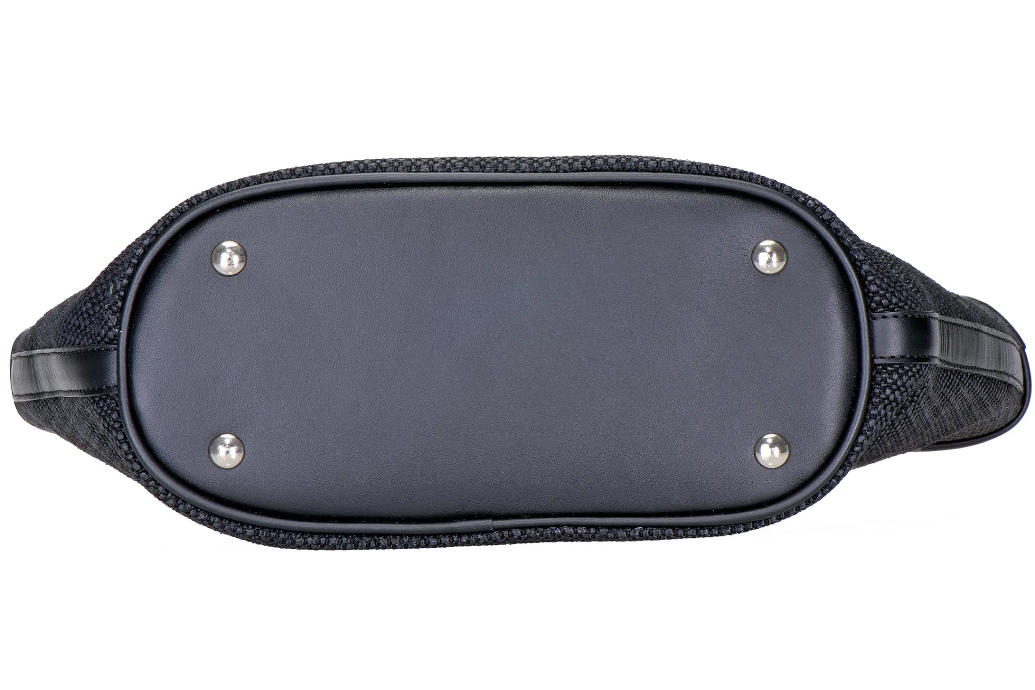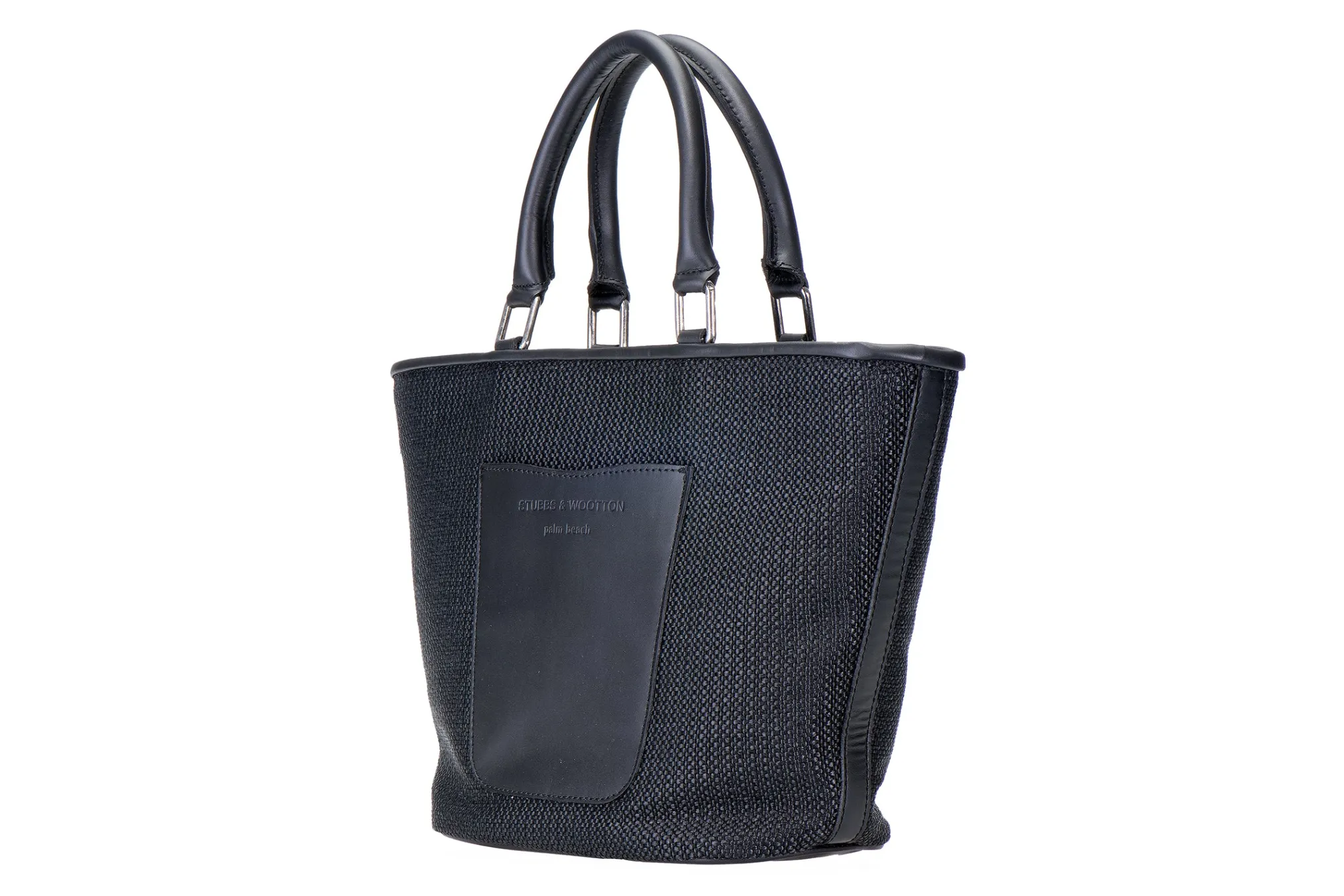 In luxuriously soft Black Leather and durablewoven Raffia, this understated mini tote is more than meets the eye.Theexquisite straps and custom hardware are specially engineered to fit together seamlessly. A center zip pocket keeps your wallet secure and an outside pocket that is smartphone perfect. Dimensions – 14″(length) X 9″(height) X 5″(depth)