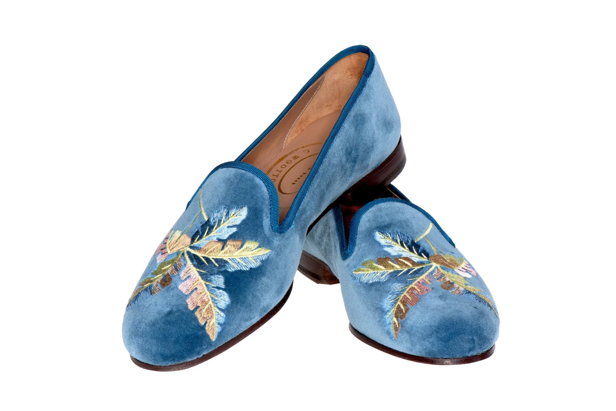 Our Broadleaf slipper features a rich cotton velvet fabric with a matching grosgrain trim. Finished with our Broadleaf embroidery. Meticulously Hand-crafted in Spain. Leather lined to provide additional support and comfort. The stacked wooden heel is 3/4″ in height. Leather soled. True to American sizing.