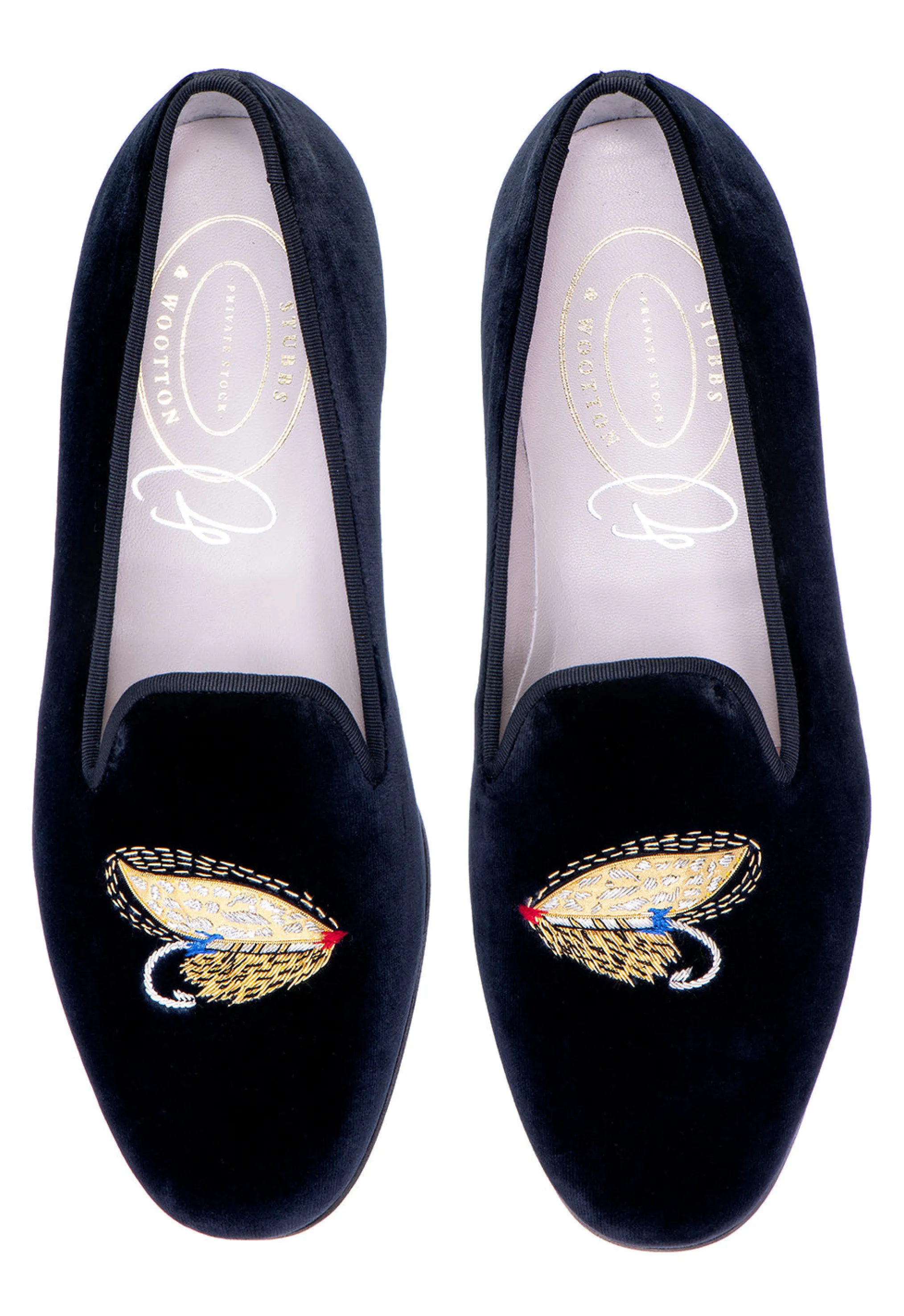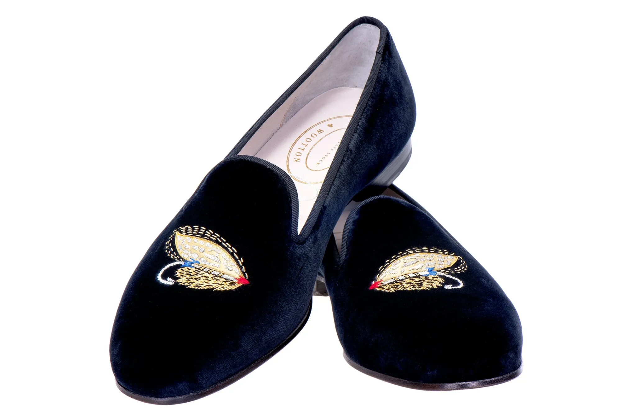 They’re quite the catch 🎣 Available for 1 week only, our exclusive Fly Fishing Trunk Show explores one of our favored sports. We’ve selected an array of archival embroideries, one of a kind, hand-embroidered motifs and created a collection of never seen before styles all in the name of fly-fishing! OurFlyPS slipper features the finestMidnight Blue Sea Island Cotton-Velvet Upper with a matching Grosgrain Trim. Featuring ourFly motif, Hand-Embroidered in London using gold wire. Meticulously Hand-crafted in Spain. Leather lined to provide additional support and comfort. The stacked wooden heel is .75 inches in height Leather soled. True to American sizing.