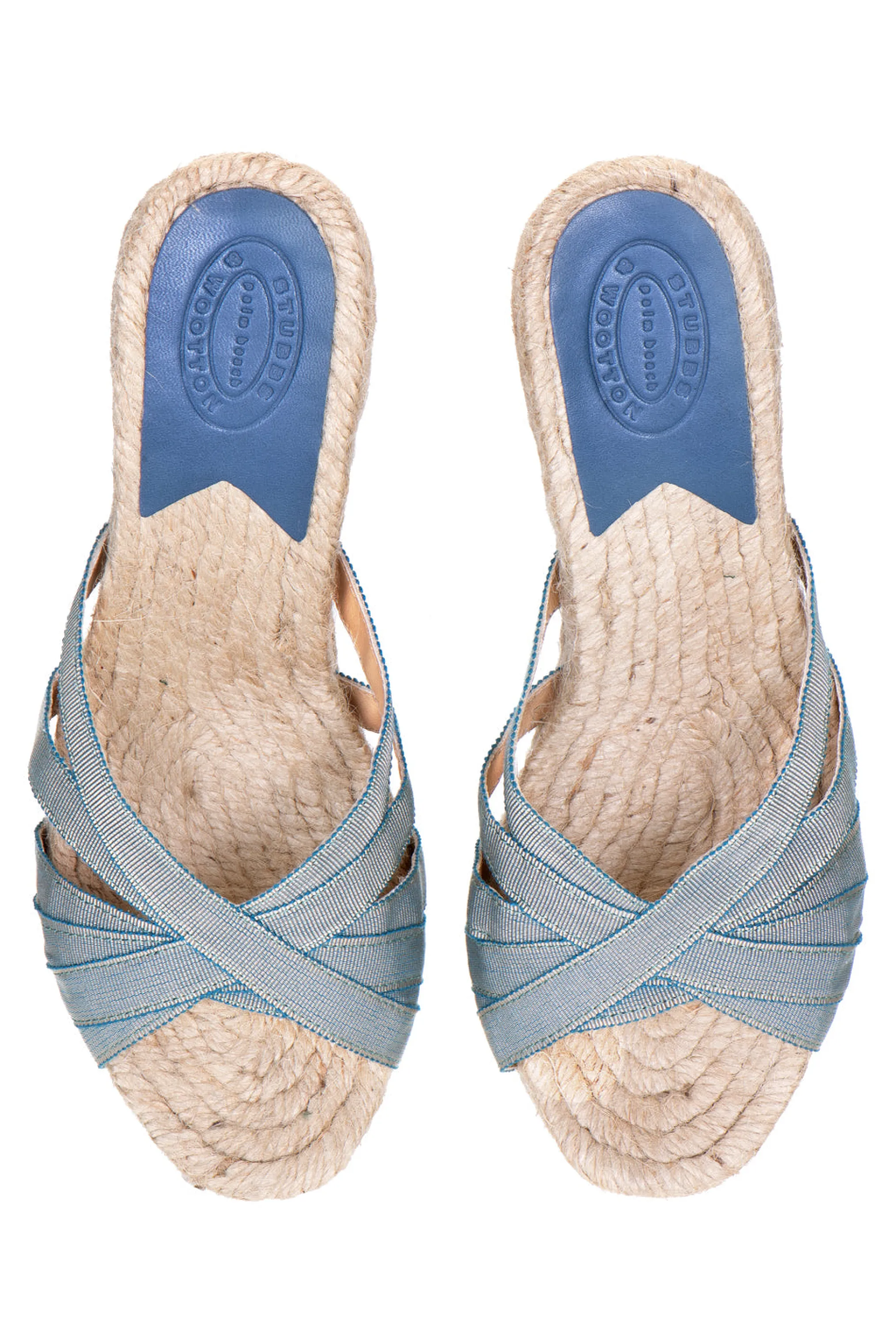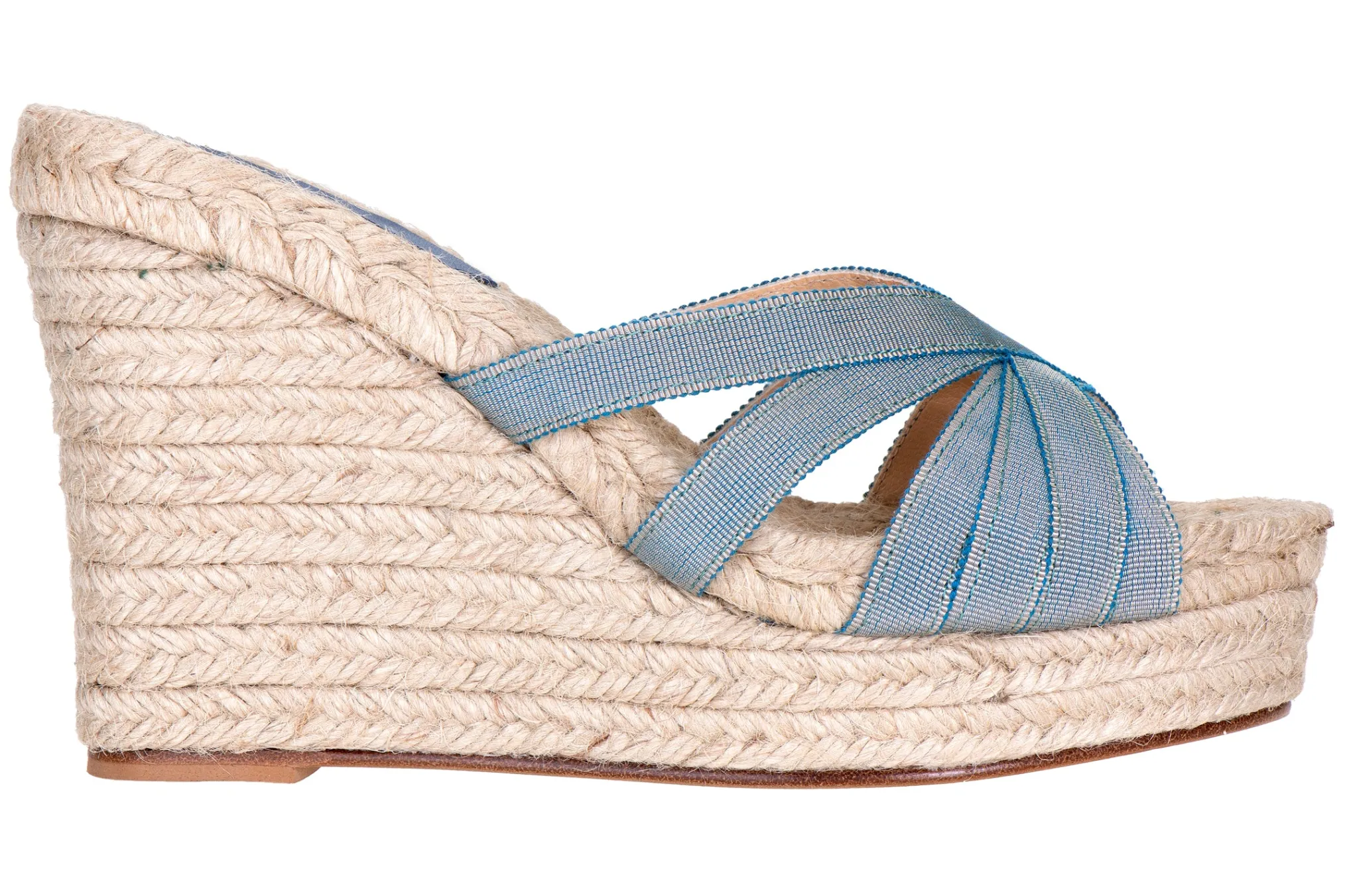 Our Grace Rib Jeans Espadrille features a Blue Grosgrain Ribbon and Jute Sole. Meticulously Hand-crafted in Spain. The heel is 5 inches in height. Leather soled. True to American sizing. If you wear a half size typically, go to the size up.